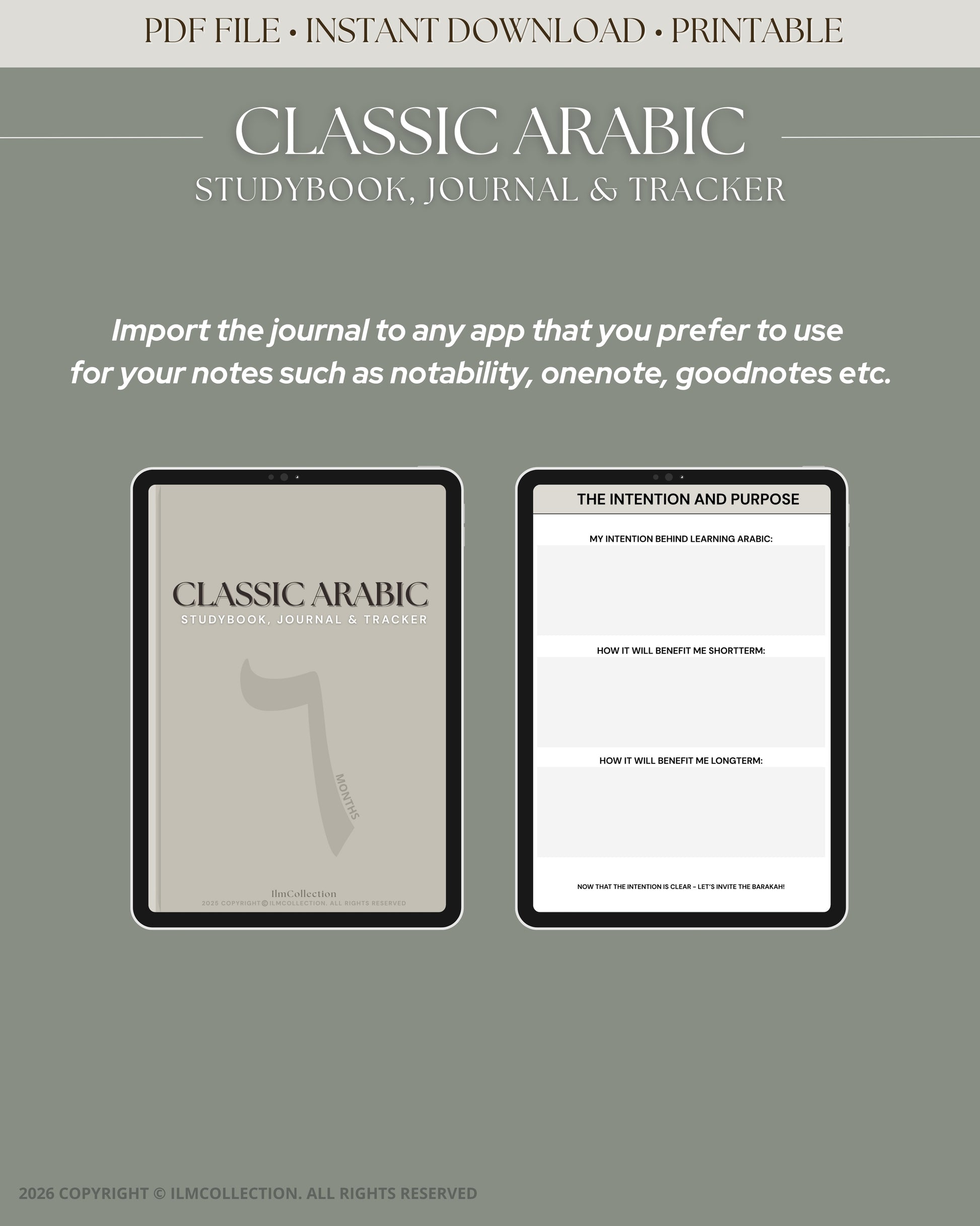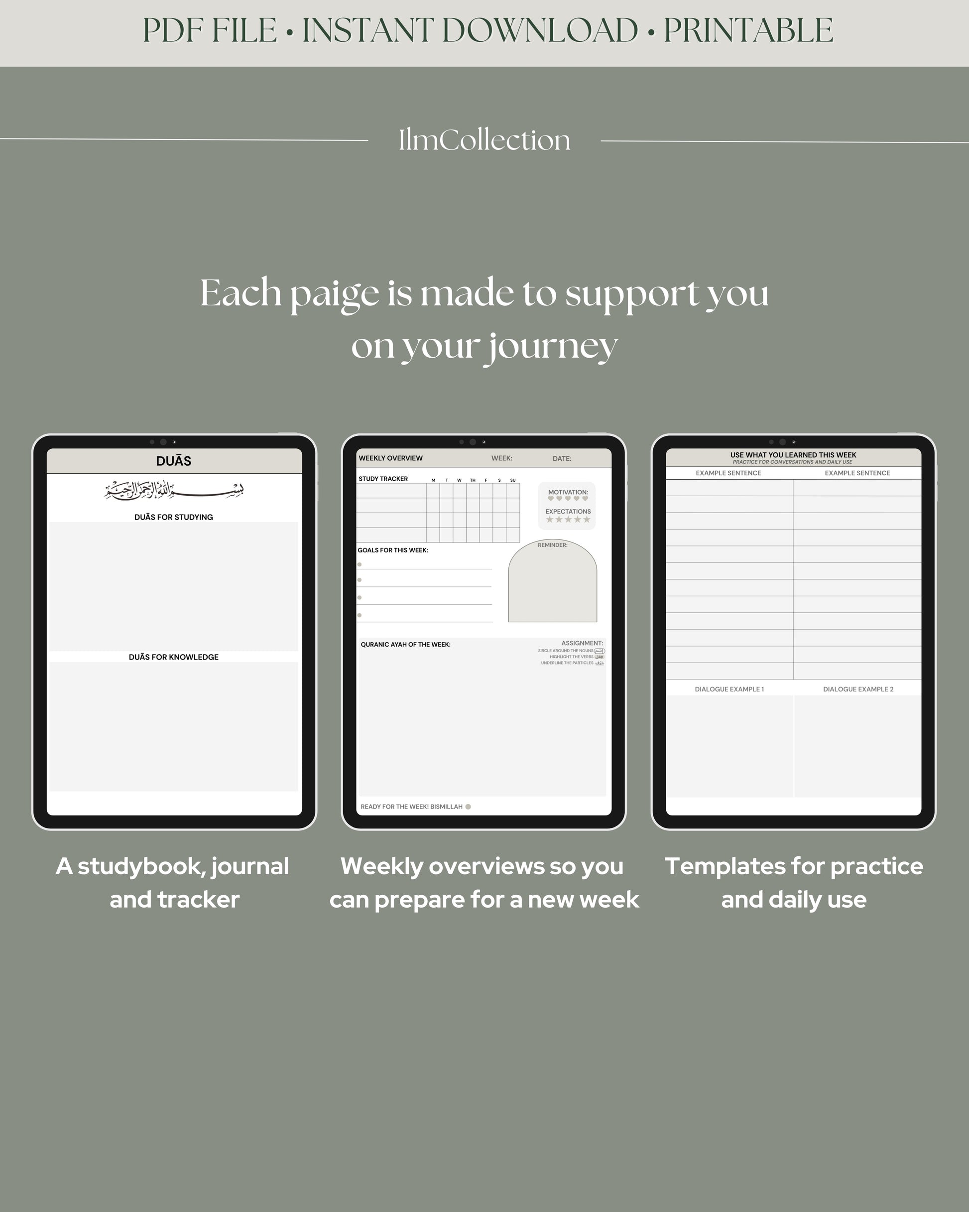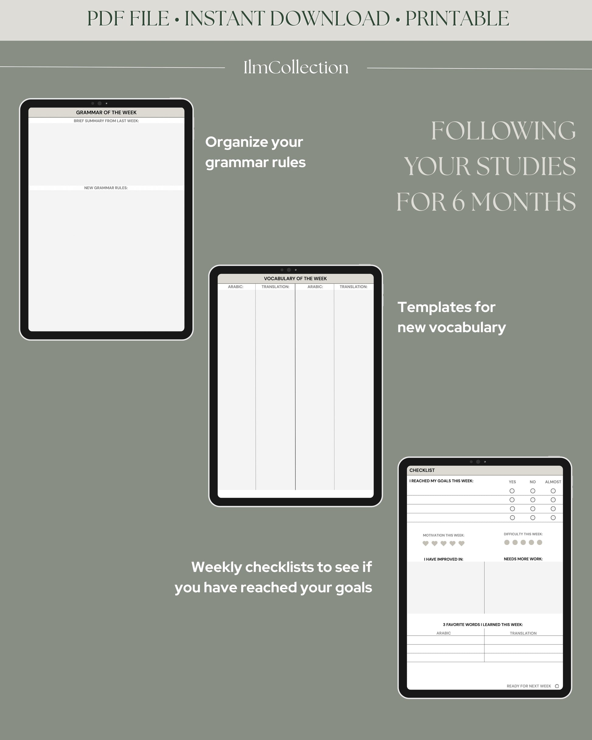 A digital, structured study companion designed to support your journey in learning Arabic. This 6-month program guides you week-by-week, helping you build a strong foundation in Fusha (Classical Arabic) through consistent practice and reflection.
